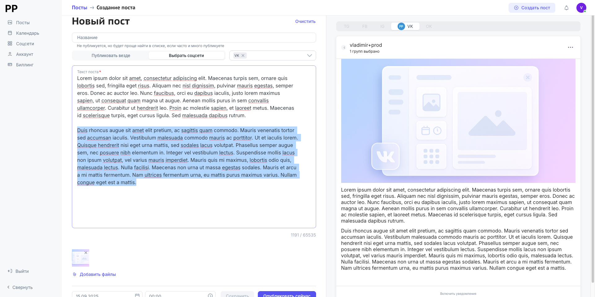 Теперь в интерфейсе создания публикаций можно создавать публикации для социальной сети ВКонтакте. В правой части вы сможете увидеть превью того, как будет выглядеть сама публикация. А выбрать саму сетку, можно в правой части окна в настройках выбора самой сети.