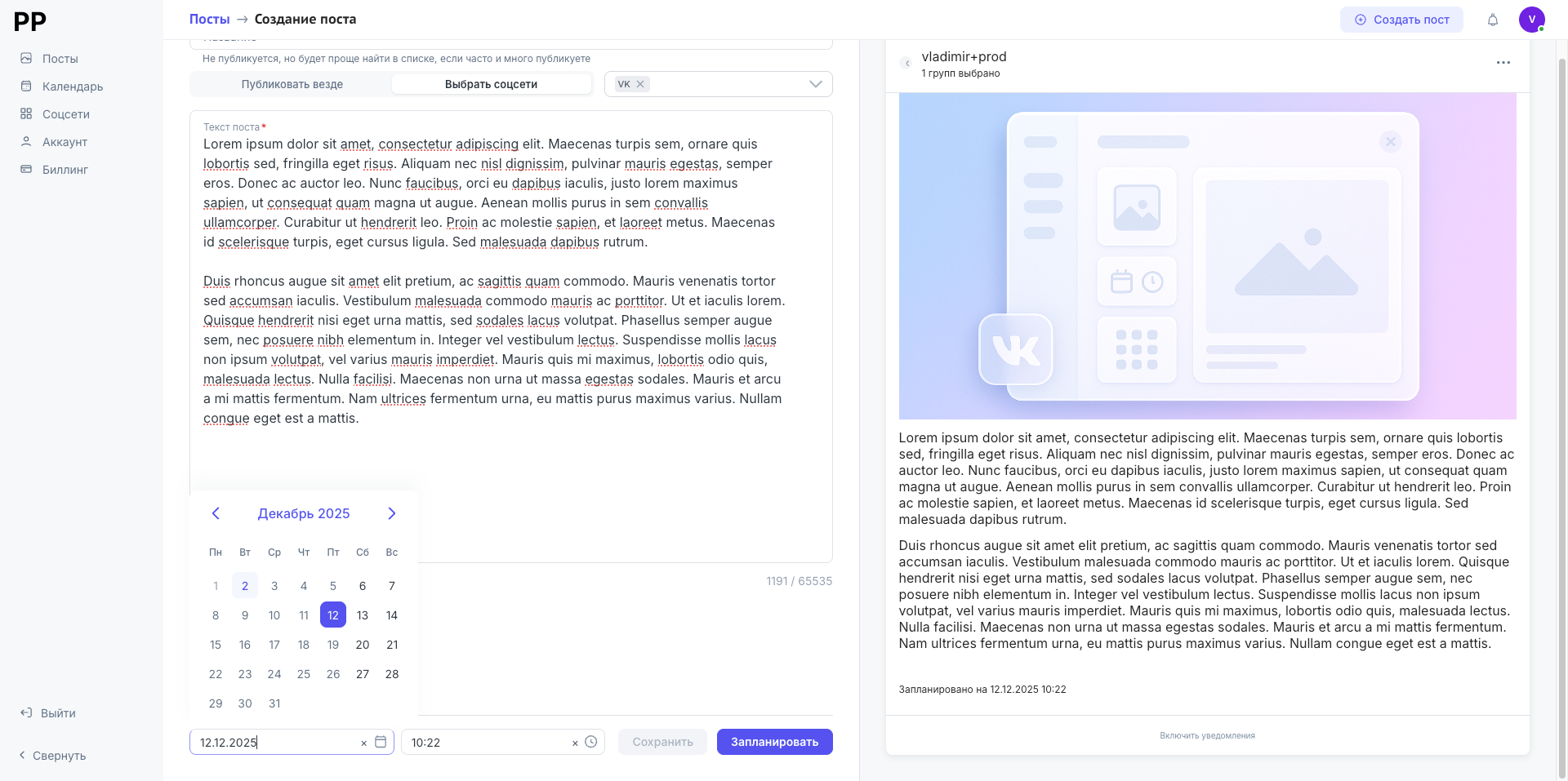 Была так же добавлена возможность выбрать дату и время для вашей публикации и запланировать эту публикацию. В ближайшее время будет закончен интерфейс списка публикаций - там вы сможете увидеть все уже отправленные публикации, а так же и будущие публикации. Их можно будет увидеть, раскрыть и изменить дату публикации, или само наполнение публикаций.